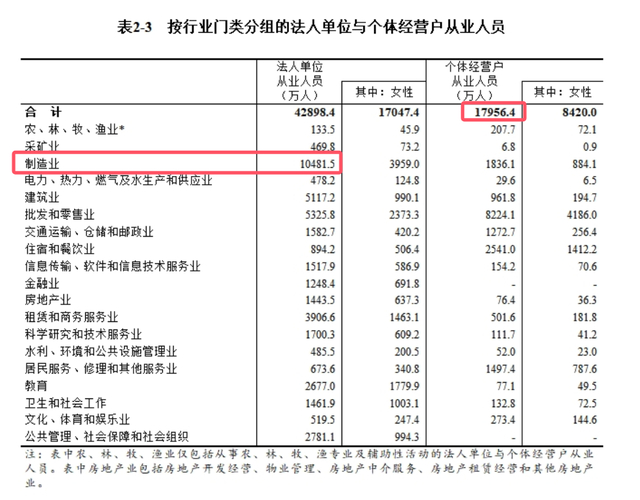 第二,制造业依旧是我们的根基,创造了最多的就业。2023年末,制造业法人单位有404.9万个,占第二和第三产业法人单位的12.2%,但制造业从业人数却高达制造业10481.5万人,占24.4%,是从业人员最多的一个行业。