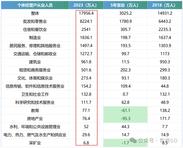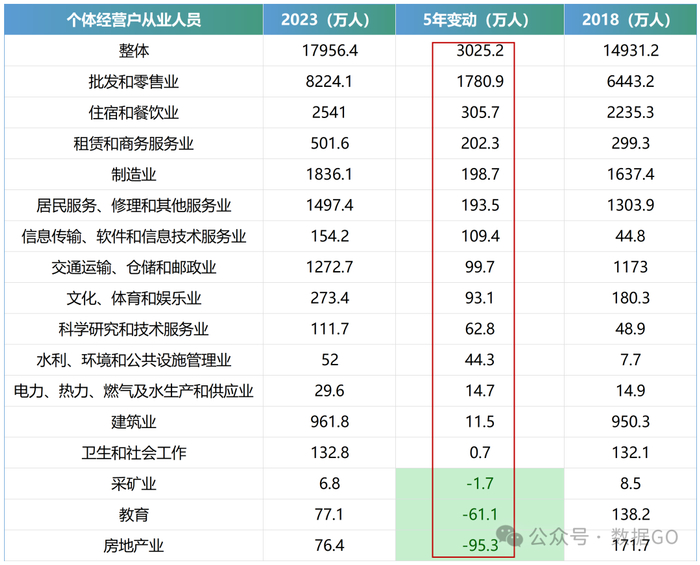 表:个体户从业人员排名(按行业绝对值5年变动排序)