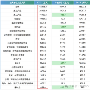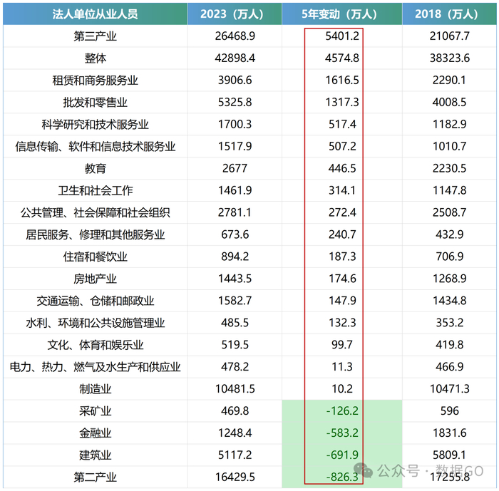 表:法人单位从业人员排名(按各行业绝对值5年变动排序)