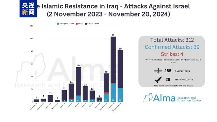 △据以色列智库统计,自2023年11月2日至2024年11月20日,伊拉克“伊斯兰抵抗组织”针对以方目标发动了312起袭击,其中89起袭击实际到达以色列境内。