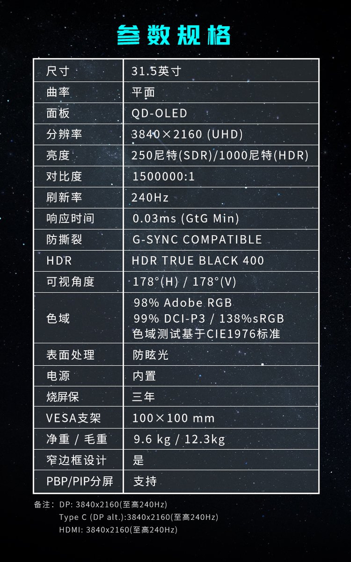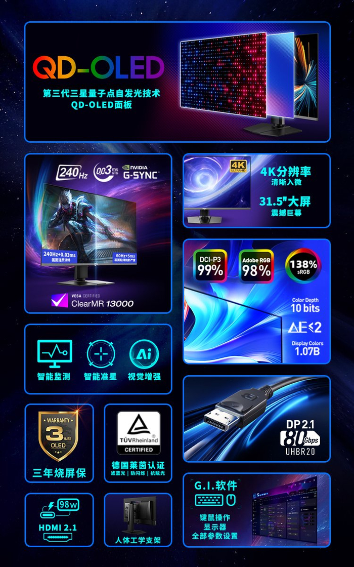 这款显示器配备了一块31.5英寸的超大屏幕,分辨率高达4K(3840x2160),画面清晰细腻。其面板类型为QD-OLED,融入了第三代三星量子点自发光技术,确保了出色的色彩表现和画面质量,为用户带来更加真实、生动的视觉效果。