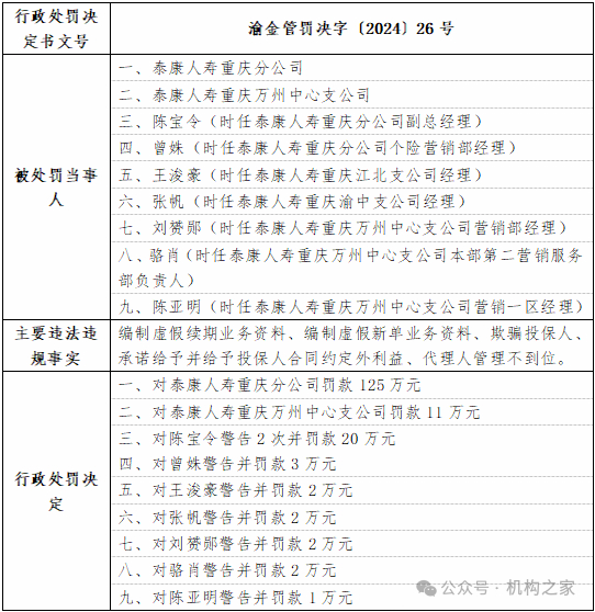 此外,此次违规行为的责任不仅仅落在了公司身上,更有7名相关责任人被监管处罚。泰康人寿重庆分公司副总经理陈宝令因负有责任而被罚款20万元并受到2次警告;个险营销部经理曾姝被罚款3万元并警告;江北支公司经理王浚豪等3人各自被罚款2万元并警告;万州中心支公司营销一区经理陈亚明被罚款1万元并警告。
