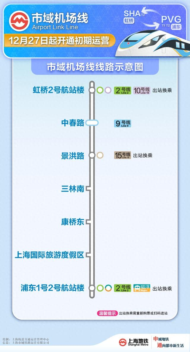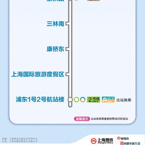 市域机场线初期运营里程约59公里,共设车站7座(依次为虹桥2号航站楼站、中春路站、景洪路站、三林南站、康桥东站、上海国际旅游度假区站、浦东1号2号航站楼站),其中,站内换乘车站1座、出站换乘车站3座。