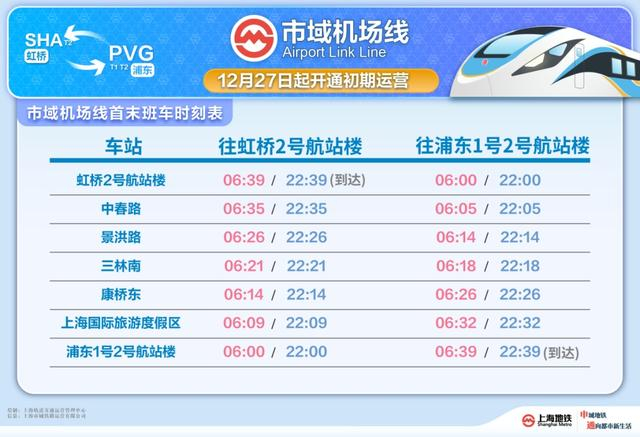 虹桥2号航站楼站和浦东1号2号航站楼站首班车发车时间均为06:00;末班车发车时间均为22:00。