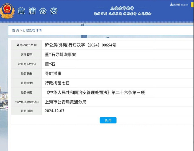 根据上海市公安局黄浦分局公示的行政处罚决定书显示,12月3日,董某石因寻衅滋事被警方处以行政拘留7日的处罚。
