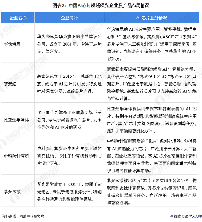 中国AI芯片行业正伴随着中国人工智能产业的快速发展而发展,竞争格局逐步形成。华为海思通过昇腾系列AI芯片在数据中心和5G领域占据优势,寒武纪专注于深度学习加速,推出的AI芯片广泛应用于云计算和自动驾驶。紫光国微和中科院计算所也积极布局AI芯片,支持智能终端和物联网应用。比亚迪半导体则专注于新能源汽车领域的AI芯片。