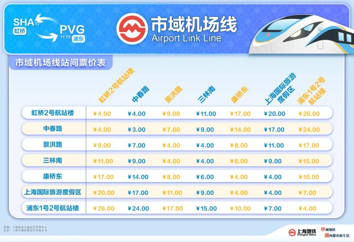 市域机场线(虹桥2号航站楼站~浦东1号2号航站楼站)全程26元。