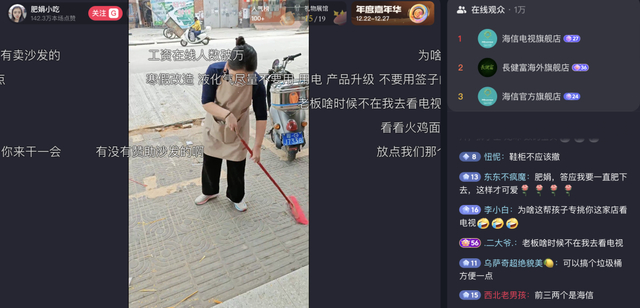 12月27日12时,@肥娟小吃 还开了直播介绍当天的营业情况,因为时值中午,来买小吃的人不算多,夫妻俩一边打扫卫生,一边回复网友评论,仍有不少网友为二人的小店提出建议。