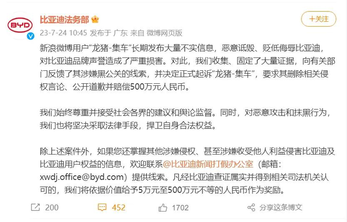 每经小编注意到,2023年7月24日,比亚迪法务部官微发布首条微博称,新浪微博用户“龙猪-集车”长期发布大量不实信息,恶意诋毁、贬低侮辱比亚迪,对比亚迪品牌声誉造成了严重损害。对此,比亚迪收集、固定了大量证据,向有关部门反馈了其涉嫌黑公关的线索,并决定正式起诉“龙猪-集车”,要求其删除相关侵权言论、公开道歉并赔偿500万元人民币。
