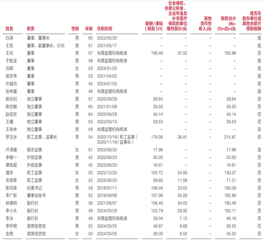 相较之下,广发银行董事长、行长的薪酬比其他高管低一截。年报显示,广发银行2023年薪酬最高的是监事长罗玉冰,为215.87万元;其次是董事王兵的193.98万元;纪委书记与副行长的薪酬在190万左右。