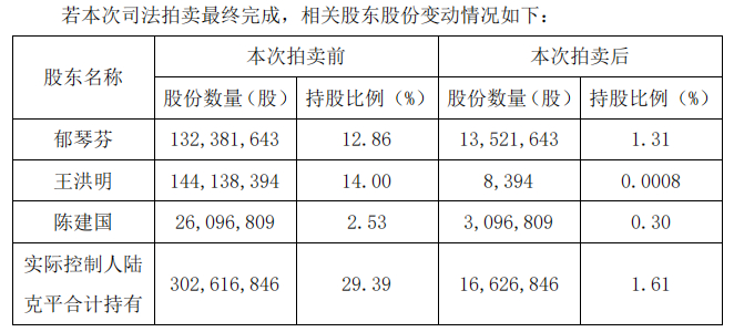 福建碧水农业投资有限公司以3.88亿元的底价竞得,每股不到1.36元。若拍卖最终完成,郁琴芬、王洪明和陈建国(上述三人均为陆克平的一致行动人)的持股比例大幅下降,陆克平持股比例将从29.39%降至1.61%,公司实控人将变更为碧水农业。