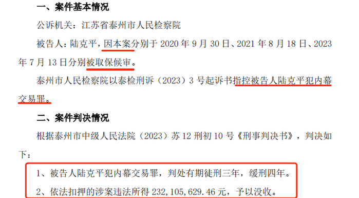 陆克平因本案于2020年9月30日、2021年8月18日、2023年7月13日先后被取保候审。泰州市人民检察院以泰检刑诉(2023)3 号起诉书指控其犯内幕交易罪,陆克平被判有期徒刑三年,缓刑四年,涉案违法所得2.32亿余元依法没收。
