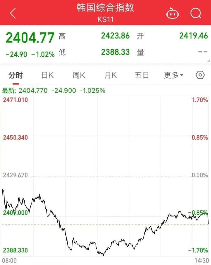韩国股市也大幅下挫,韩国综合指数盘中跌幅一度接近2%,截至收盘,跌幅收窄至1.02%。年初至今,韩国综合指数跌幅超过9%,韩国KOSPI200指数跌11%,使得韩国股市成为亚洲表现最差的市场。