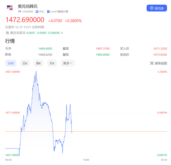 12月27日,韩国金融市场再次遭遇抛售潮。当天盘中,韩元对美元汇率跌幅一度跌至1美元兑1487.5韩元,刷新了15年多新低。不过,午后韩元又大幅反弹,截至发稿时,韩元对美元汇率跌0.28%报1美元兑1472.69韩元。