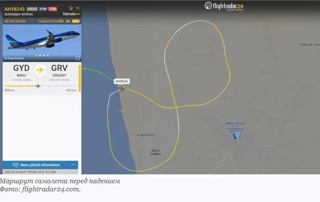 公开飞行数据显示,飞机在到达里海上空后,飞行轨迹变得有些诡异。一开始向北,往俄罗斯方向,然后突然90度转弯,飞向哈萨克斯坦方向。飞机在到达阿克套机场前做“8字形”盘旋动作,随后进入俯冲状态,以机头朝下、向右转弯的姿态撞地。