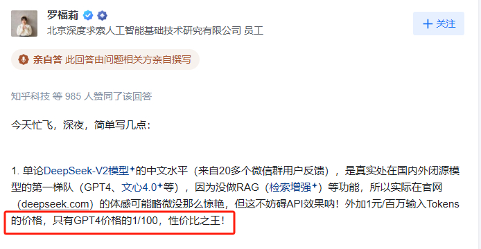 另一方面,DeepSeek-V2模型一大亮点是性价比,罗福莉表示1元/百万输入Tokens的价格,只有GPT4的1/100。这一点和小米非常契合。