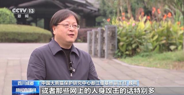中国大熊猫保护研究中心都江堰基地副主任 魏明:实际情况是美香、添添一家的身体状况是比较好的,因为美香和添添都是已经进入老年的大熊猫,它们虽然有些老年大熊猫的疾病,但是美方对疾病的预防、控制以及治疗都非常到位。之后有人把我的采访照片和以前的照片在网上拿出来,说这就是卖国贼。还对我进行人身威胁,在网上对我说:做事做人要小心,如果遇到的话,就一刀把你砍死。网上人身攻击的话特别多。