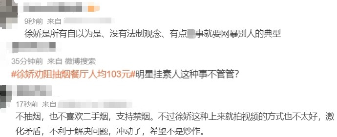 26日中午,演员徐娇在微博发文称,在长沙的一家餐厅遇到一位抽烟的男士,让服务员劝阻后仍放话“我把这支抽完”。