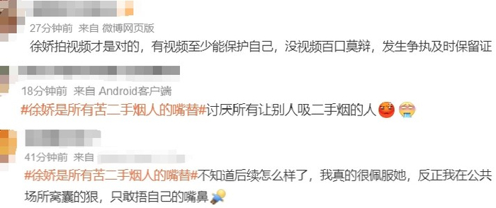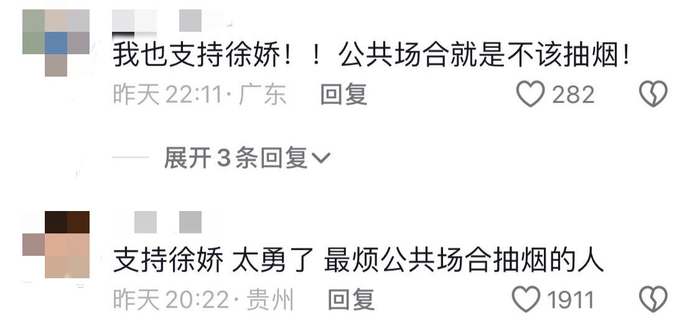 有网友支持徐娇,呼吁加强对公共场所吸烟行为的管理和处罚;
