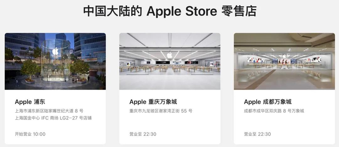 作为补充,中国大陆地区目前有47家Apple Store直营店,其中北京5家、上海8家、天津3家、重庆3家、云南1家(昆明)、四川2家(成都)、山东2家(济南与青岛)、广东4家(广州与深圳)、广西1家(南宁)、江苏5家(南京、无锡与苏州)、河南1家(郑州)、浙江4家(杭州、宁波与温州)、湖北1家(武汉)、湖南1家(长沙)、福建2家(厦门与福州)、辽宁4家(大连与沈阳)。此前网传