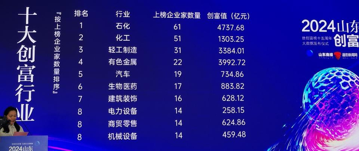 按上榜企业家数量排序,十大创富行业分别为石化、化工、轻工制造、有色金属、汽车、生物医药、建筑装饰、电力设备、商贸零售、机械设备。其中,石化以4737.68亿元的创富值遥遥领先,充分展现了石化产业在山东不可撼动的产业地位。今年9月,2024中国石油和化工企业销售收入500强在东营发布,其中山东93家企业入围,居全国首位。