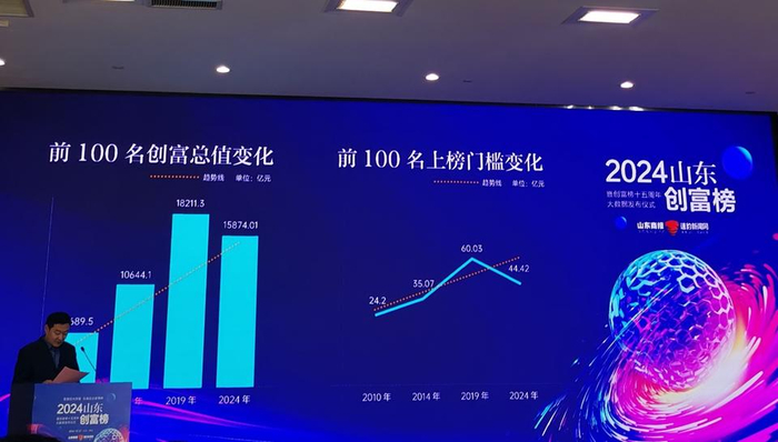 会上还发布了山东创富榜15周年大数据。与2010年比,前100名上榜门槛由2010年的24.2亿元涨至2024年的44.42亿元,15年上涨84%。