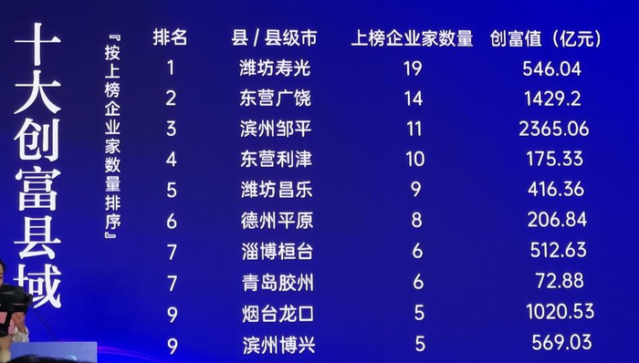 从县域经济来看,十大创富县域创造的财富占据2024创富总额的38%,且均集中在胶东经济圈和省会经济圈。潍坊寿光是孕育企业家最多的县域,共有19位企业家入选今年榜单,创富总值为546.04亿元。