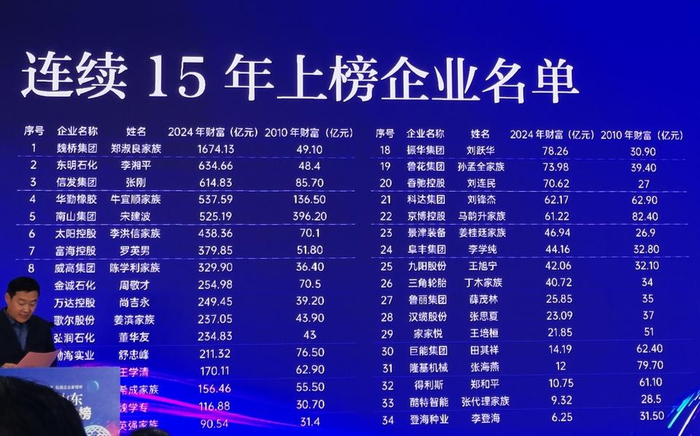 据悉,山东创富榜自2010年首次推出以来,已连续发布了15年。今年上榜的十大创富企业家分别是,魏桥集团的郑淑良家族、东明石化的李湘平、信发集团的张刚、华勤橡胶的牛宜顺家族、南山集团的宋建波、太阳控股的李洪信家族、道恩集团的于晓宁家族、富海控股的罗英男、奥德集团的林凡连以及威高集团的陈学利家族。