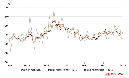 韩国海关公布的12月前10日、前20日出口金额数据则分别同比增长12.4%、6.8%,预示着12月韩国出口应当不弱。