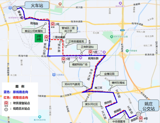 途经道路调整为:鼎昌街、文德路、鼎瑞街、文兴路、鼎尚街、文治路、南三环、中州大道、航海东路、城东路、二里岗南街、紫荆山路、陇海路、钱塘路、敦睦路、大同路、下行(一马路、陇海路)。