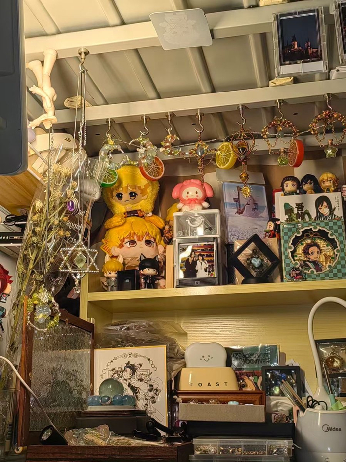 言槐在狭小的宿舍床上放了一张小桌,上面摆满了水晶,每次躺在床上看到它们,她就很开心,“我每天看一看,摸一摸,甚至把它们拆开,再花几个小时去重新DIY,都能让我放松心情、减少压力。”