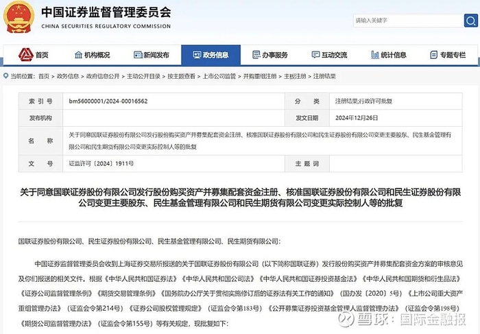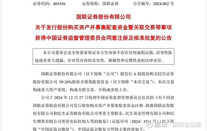 五是注册同意。2024年12月27日,中国证监会发布《关于同意国联证券股份有限公司发行股份购买资产并募集配套资金注册、核准国联证券股份有限公司和民生证券股份有限公司变更主要股东、民生基金管理有限公司和民生期货有限公司变更实际控制人等的批复》。