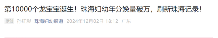 广东珠海市妇幼保健院产科2024年的总分娩量则在11月27日突破了1万例,成为珠海市至今首家年分娩例数过万例的医院。