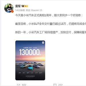 随后,雷军在新推文表示:我们任务从最早的7万,提高到10万,到12万,最后13万。作为汽车行业新人,SU7上市9个月,交付超过13万辆,绝对是奇迹!感谢大家支持!