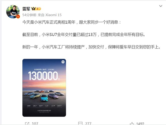 雷军最新发文:SU7全年交付量超13万台,小米汽车:累计智驾里程突破1亿公里