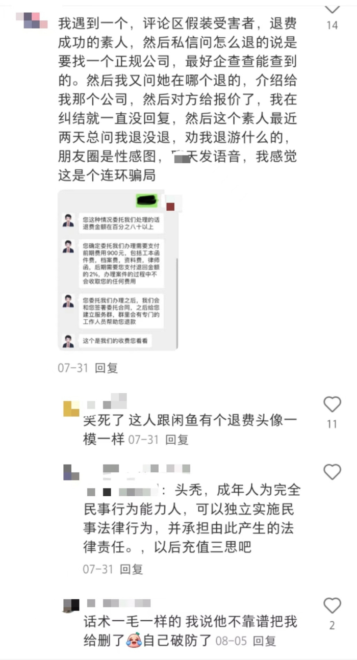 2024年8月,B站博主“滤镜粉碎机”通过近两个月的暗访了解到,这些代退费的法律咨询公司,退费成功的截图实为P图,公司的“法务”实际是中专毕业。
