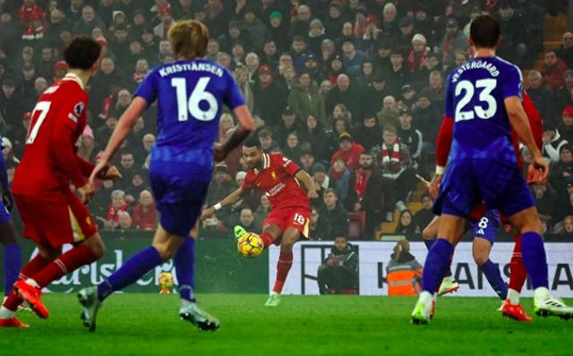 第 23 分钟,加克波在中场附近接球后,展现出了精湛的个人技术,他横向盘带,试图摆脱防守球员,创造出射门空间。在连续晃动几名对手后,他瞅准时机,起脚劲射,可惜足球稍稍偏出球门立柱,利物浦再次与进球擦肩而过,球员们懊恼地捶打着草地,主场球迷们也为这一错失的机会感到惋惜。