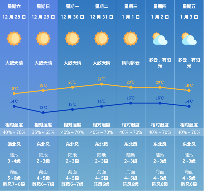 广东省气象台预计,未来三天我省大部天晴干燥,早晚寒冷、昼夜温差大,29-30日早晨粤北市县最低气温1~5℃,高寒山区零下3~1℃,局部有霜冻或冰冻。28-29日,我省海面、南海中北部海面和台湾海峡风力6~8级阵风9级。