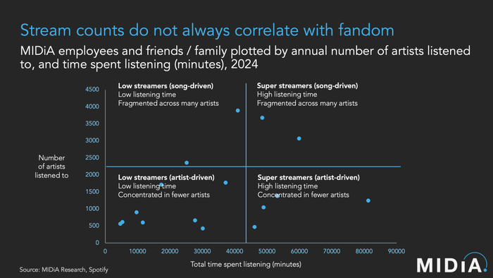 但从艺术家长期发展和超级粉丝的培养来看,以艺人为中心聆听的用户会更有价值,这类用户可能更愿意在周边商品和演唱会门票上花费更多。然而,Midia的调研显示,大多数听众都落在了“总听歌时间较少、听过的艺术家数量较少”的象限,且其中包括了一些狂热粉丝。