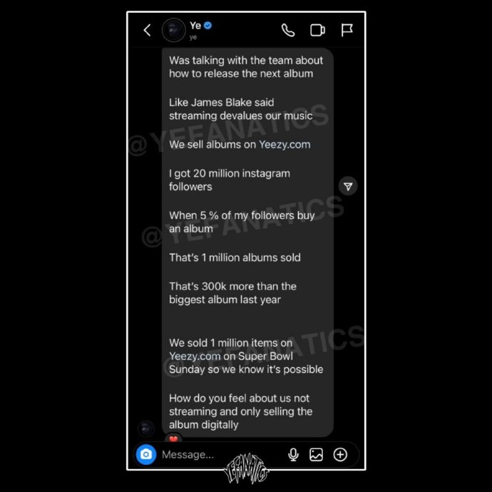 早在2022年,Kanye West就曾宣布新专辑《Donda 2》不会在流媒体上线,仅在他推出的播放器Stem Player(售价200美元)独家上架。今年3月,Kanye West再次发文称,流媒体贬低了音乐的价值,表示会在其个人网站Yeezy.com上发售专辑。