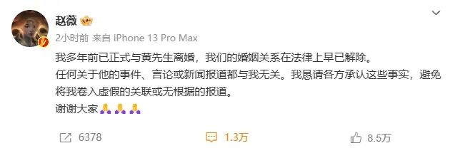 12月28日,演员@赵薇 发布消息称:“我多年前已正式与黄先生离婚,我们的婚姻关系在法律上早已解除。任何关于他的事件、言论或新闻报道都与我无关。我恳请各方承认这些事实,避免将我卷入虚假的关联或无根据的报道。谢谢大家。”