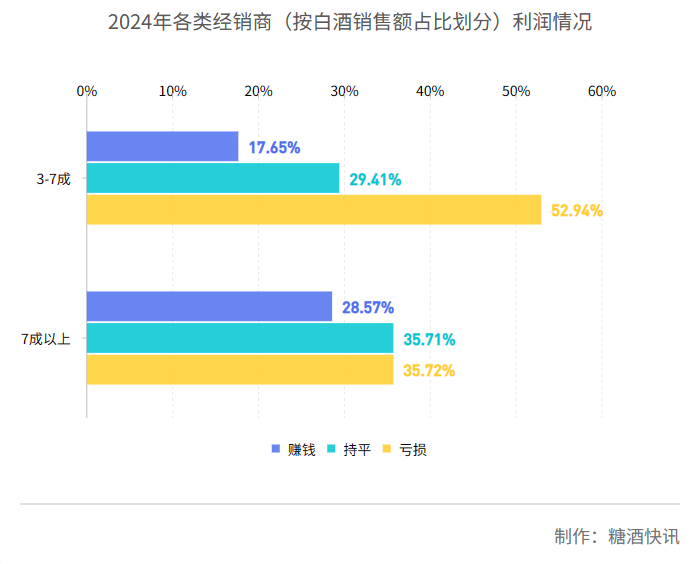 同时,白酒销售额占比更高的经销商利润反馈情况更好一些(白酒销售额占比在3成以下经销商样本过少暂未列入统计)。白酒销售额占比在3-7成的经销商中,反馈“赚钱”“利润持平”“未赚钱”的经销商占比分别为17.65%、29.41%、52.94%;白酒销售额占比在7成以上的经销商中,反馈“赚钱”“利润持平”“未赚钱”的经销商占比分别为28.57%、35.71%、35.72%。