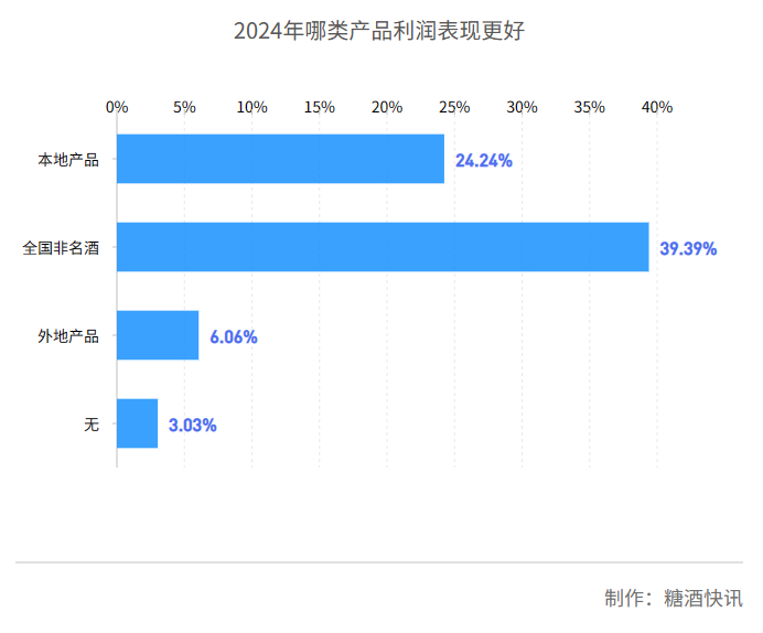 在“2024年哪类产品利润更好“问题上,39.39%的受访经销商反馈,“全国非名酒”是2024年利润表现最好的产品,还分别有27.27%、24.24%、6.06%的经销商反馈“本地产品”“全国名酒”“外地产品”2024年利润表现较好,仅有3.03%的经销商反馈2024年所有产品利润表现都不好。