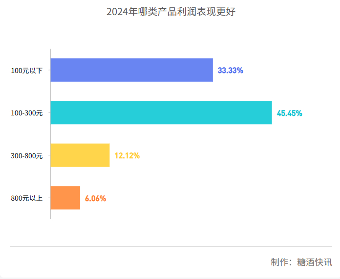 进一步拆解价位可以发现,300元以下的中低端大众白酒利润表现普遍更好,在受访经销商的反馈中占比达到了78.78%,其中100元以下价位产品占比为33.33%,100-300元价位产品占比为45.45%,而300-800元、800元以上的中高端、高端产品占比仅为12.12%、6.06%。