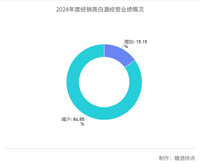 2024年,业绩下滑之风近乎席卷了整个白酒流通渠道。问卷调查结果显示,业绩有所减少的经销商占比高达84.85%,仅有15.15%的经销商2024年业绩出现了不同程度的增长。
