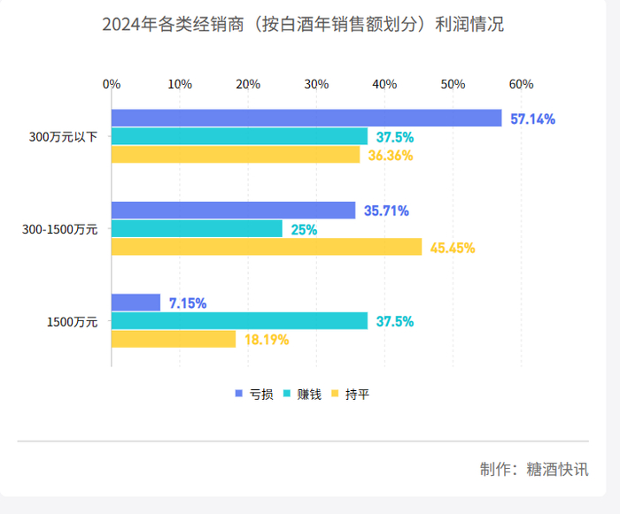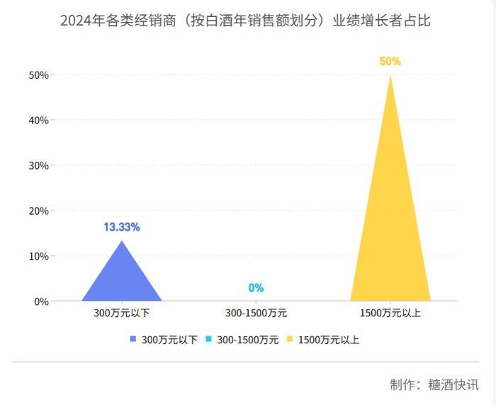 从经销商经营规模的角度来看,年销售额超1500万元的受访经销商中,2024年业绩出现了增长的酒商占比约为50%;年销售额在300万元-1500万元的受访经销商中,没有一位受访经销商反馈2024年实现业绩增长;年销售额在300万元以下的受访经销商中,业绩出现增长的占比约为13.33%。