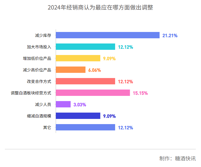 对于2025年的调整方向,调整产品结构是众多经销商的重要选择之一(占比约为24.24%)。在将“调整产品结构”列为2025年主要调整方向的经销商中,25%的受访者表示将减少高价位产品,37.5%的受访者将增加低价位产品。在后续电话回访中,近乎所有受访经销商均表示考虑增加高性价比产品,其中北京经销商陈总更表示:“2024年汾酒黄盖汾、红盖汾等全国名牌大单品光瓶卖的好,2025年将重点卖全国名牌工薪价位的酒。”