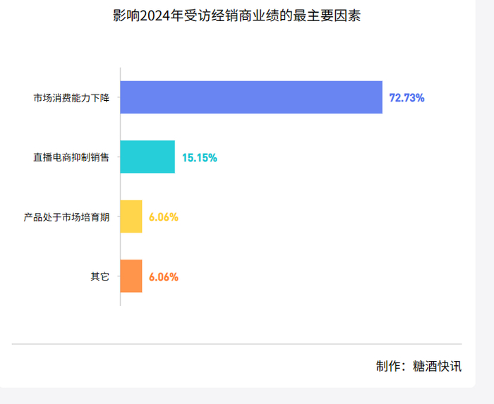 对于2024年白酒销售业绩普遍承压的情况,72.73%的受访经销商认为“市场消费能力下降”是罪魁祸首。在2024年业绩出现下滑的经销商中,约有78.57%的经销商将业绩下滑归咎于它;而在业绩出现增长的经销商中,也有40%的经销商认为今年市场消费能力在下降。河南经销商穆总反馈:“2024年消费客单与客单价都在减少,消费整体在降维。”另一经销商陈总也反馈:“今年大家都不咋消费了。”