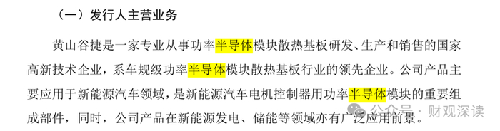 “黄山谷捷是一家专业从事功率半导体模块散热基板研发、生产和销售的国家 高新技术企业,系车规级功率半导体模块散热基板行业的领先企业。公司产品主 要应用于新能源汽车领域,是新能源汽车电机控制器用功率半导体模块的重要组 成部件,同时,公司产品在新能源发电、储能等领域亦有广泛应用前景。”黄山谷捷在招股书中称。
