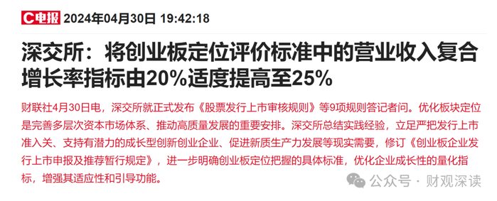 值得一提的是,创业板上市公司,尤其要强调其成长性。今年4月,深交所正式发布《股票发行上市审核规则》等9项规则答记者问,其中明确将创业板定位评价标准中的营业收入复合增长率指标由20%适度提高至25%。